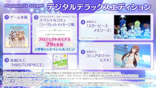 ※ 내용물의 스페셜 의사와 각 DLC는 「아이돌 마스터 스타 릿 시즌」본편 발매로부터 약 1 개월 후에 판매를 예정하고 있습니다.