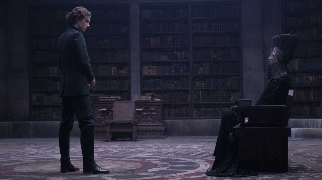 Paul(Timothee Chalamet)과 Bene Gesserit 목사의 어머니(Charlotte Rampling)는 DUNE에서 서로를 조심스럽게 생각합니다.