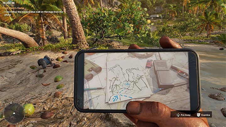 해변을 둘러봐야 합니다. 예를 들어 검색 영역이나 대화형 컨테이너 및 개체(게임 후반부)와 같이 볼 수 있는 왼쪽 하단 모서리 의 레이더 에 주의 하십시오. 첫 번째 임무 목표를 완료하려면 야자수 옆에 있는 상자 를 조사해야 합니다 . 상자 에는 PMM 권총 이 들어 있습니다 . 불행히도, 이 첫 번째 총기의 탄약은 다른 곳에서 구해야 합니다.