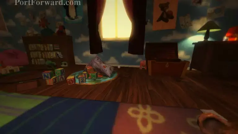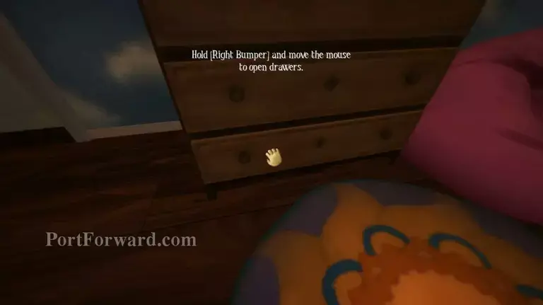 울타리를 올라 반대편으로 내려간 다음 엄마가 선물 상자를 두었던 서랍으로 가십시오. 거기에 도달하면 맨 아래 서랍을 가리키고 RB를 누른 다음 끌어서 엽니다.