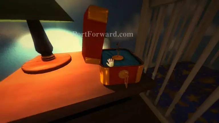 그를 다시 한 번 아기 침대로 따라가서 하단 서랍을 꺼냅니다. 서랍 위로 올라가 오르골과 상호 작용하십시오.