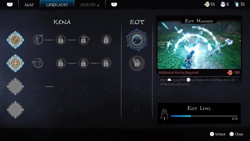Kena에는 기본 업그레이드 트리, 4개의 선형 경로(처음부터 2개가 표시됨) 및 Rot로 업그레이드할 수 있는 공간이 있습니다. 카르마는 업그레이드에 사용하는 통화로 부패한 과일을 먹고 부패한 지역을 정화하는 등의 작업에서 수집됩니다. 카르마는 수정보다 수집하기가 더 어렵기 때문에 주의하십시오.