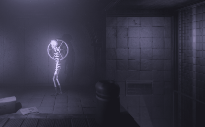 벽에 디스크가 보이시나요? 전원 코드가 왼쪽의 스위치에 닿을 수 있도록 돌려야 합니다. 그 후 왼쪽으로 가면 아직 사용할 수 없는 레버가 있는 큰 극장 방(여기를 메인 룸이라고 칭함)을 찾을 수 있습니다. 대신 바닥에 있는 작은 레버를 사용하여 수직으로 움직여야 합니다. 레버를 사용하여 UP을 누른 다음 왼쪽 벽의 Wall Walk를 누릅니다. 여기 잠긴 문이 있습니다. 열려면 바로 옆에 있는 레버를 사용하여 아래쪽으로 이동하여 도어 쪽으로 가는 코드가 파란색으로 변할 때까지 디스크를 이동합니다.