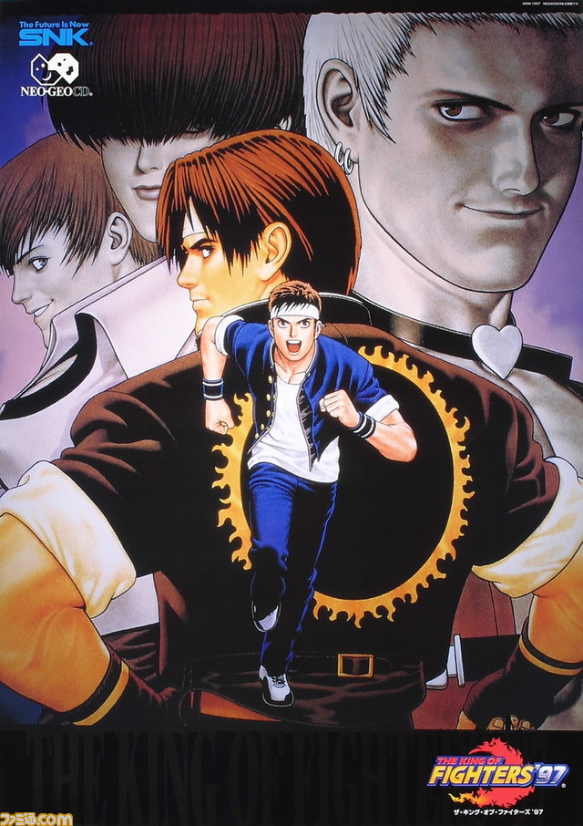 그 게임이야말로 여기서 소개하는 'KOF '94'다.주인공은 본작 오리지널 캐릭터의 쿠사나기 쿄.그 포스터는 판면 아래쪽에 주인공 팀, 위쪽에 상대팀(아랑팀)을 천지를 뒤집어 대칭적으로 배치한다는 게임 포스터로서는 대담한 구도다.이 레이아웃에서도, 3VS3 배틀이 큰 우리인 것을 여기에서도 알 수 있다.오늘까지 『KOF』라고 하면 팀 배틀이 채용되고 있지만, 그 특징을 메인 비주얼로 주장하고 있는 것은, 실은 이 예가 최초로 마지막.