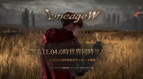 11월 4일 0시에 배포 예정인 Android/iOS/PC용 MMORPG 「리니지 W」. 본작은 PC온라인게임 ‘리니지’의 후계작으로서의 정통성을 계승하면서도, ‘월드와이드’라는 컨셉에 근거해 글로벌 전개를 전제로 전략적으로 개발된 ‘리니지’ 시리즈의 최신 타이틀이다 .