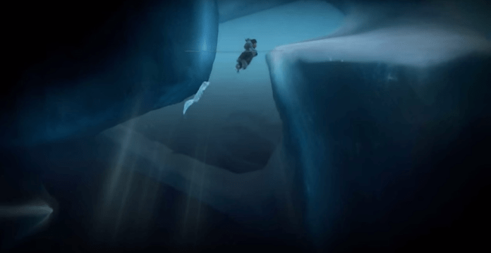 당신은 물에서 시작합니다. 수면에 도달할 때까지 수영하고 그곳에서 왼쪽으로 향합니다. 계속 진행하려면 고드름을 깨십시오. 수중으로 잠수한 다음 왼쪽까지 반원을 만듭니다.