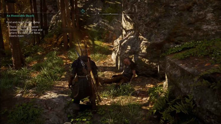 컷신이 끝나면 부상당한 사람을 찾아야 합니다. 이렇게 하려면 롱하우스의 북쪽으로 가십시오. 이 위치의 퀘스트 마커에서 부상당한 남자의 흔적을 찾아야 합니다. Odin Vision을 사용하고 녹색 목표 원과 상호 작용하십시오. 강과 부상당한 사람에게 도달할 때까지 북쪽으로 그들이 만든 석탄 길을 따르십시오. 부상당한 사람에게 다가가 그 근처에 남겨진 메모와 상호 작용하여 다음 목표를 달성하십시오.