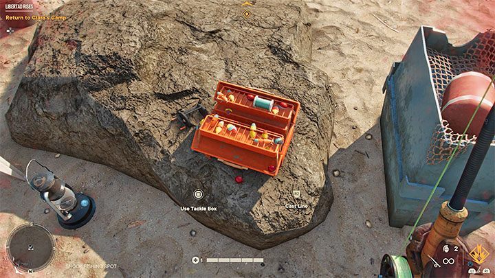 낚시는 게임 초반부터 사용할 수 없지만 캠페인 초반에 잠금을 해제할 수 있습니다. 퓨얼 레볼루션 이라는 작전을 완료하면 얻을 수 있는 보상 중 하나는 낚싯대입니다. 이 시점부터 장비 드롭다운 메뉴에서 장비를 선택할 수 있습니다(L1/LB 누른 상태).