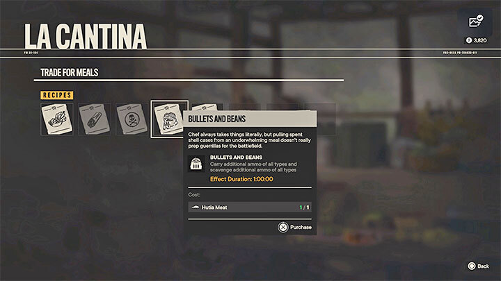 La Cantina 덕분에 동물성 고기와 생선을 사용하여 임시 스탯 보너스 를 제공하는 식사를 만들 수 있습니다 . 이러한 보너스는 예를 들어 더 많은 탄약을 소지하고 독이나 공격에 대한 저항을 증가시키는 것을 의미할 수 있습니다. 한 번에 하나의 보너스만 활성화할 수 있습니다.