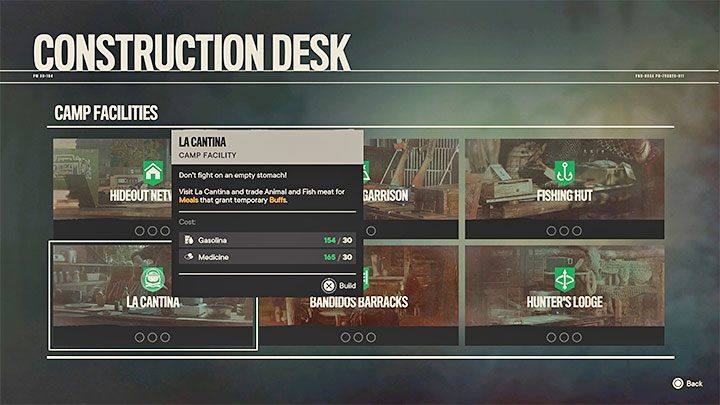 사냥과 낚시를 통해 얻은 모든 먹이는 용도가 있지만 먼저 게릴라 은신처 중 하나에 La Cantina 를 건설해야 식사 를 요리 할 수 있습니다 .