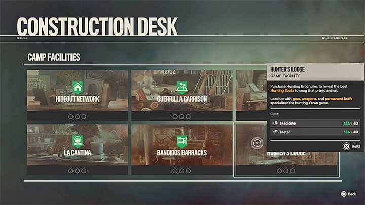 Hunter's Lodge 는 사냥을 도와드립니다. 반군 은신처(Montero Farm, Patriotas Peak 또는 Maximas Camp)에 배치할 프로젝트 중 하나로 건설 데스크에서 주문할 수 있습니다.