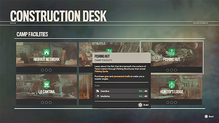 Fishing Hut 은 반군 은신처(Montero Farm, Patriotas Peak 또는 Maximas Camp)에 설치하는 프로젝트 중 하나로 건설 테이블에서 주문할 수 있는 낚시 를 도와줄 수 있습니다.