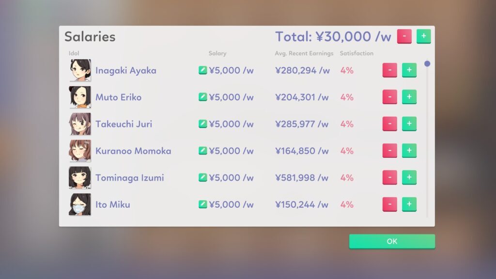 그리고 예산이 전부입니다. Glitch Pitch는 기본 난이도에 경고를 추가했을 때 농담이 아니었습니다. 대부분의 플레이어가 지속 가능한 플레이 스타일을 찾는 데 시간이 걸릴 것이라는 점을 언급했습니다. 후원자의 막대한 초기 투자에도 불구하고 처음 몇 번의 아이돌 매니저 실행 은 재앙이었습니다. 나는 회사를 여러 번 파산시켰고, 내 우상이 그들의 끔찍한 싱글을 12장이라도 팔기 위해 고군분투하면서 종종 빚을 지게 되었습니다.