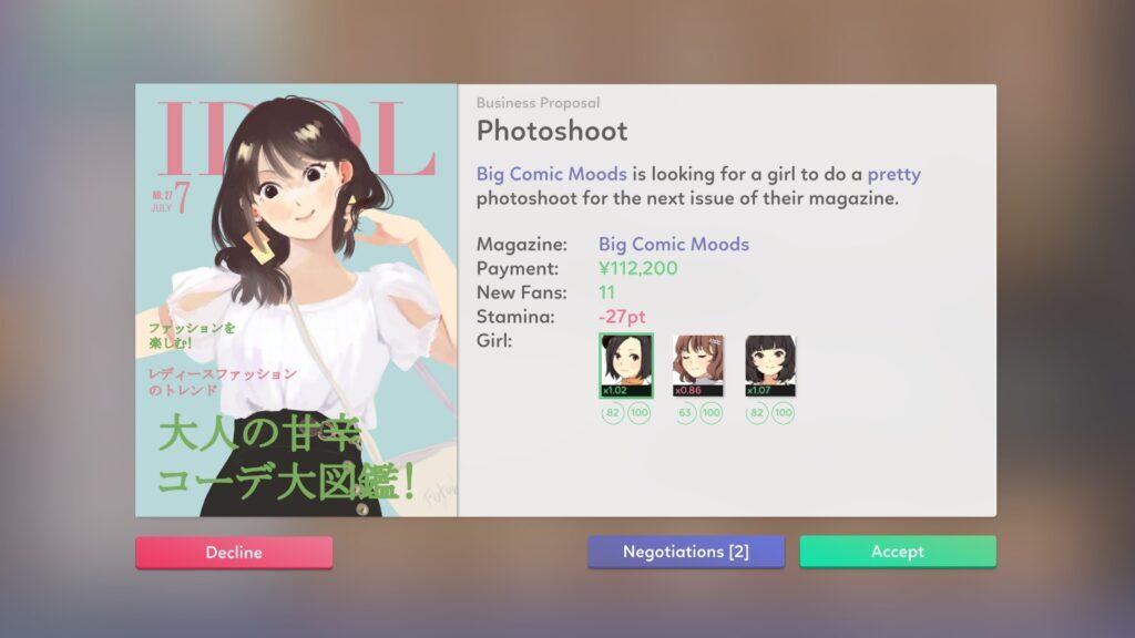 아이돌 업계가 더 거칠고, 어둡고, 추한 면이 있듯이, 아이돌 매니저 도 단점이 없지는 않다. 게임은 실시간 스타일로 작동하지만 UI에 피드백이 부족하고 쌓이는 작업의 눈보라를 더 쉽게 따라갈 수 있는 일부 도구가 없습니다. 나는 부분적으로는 하루가 끝났다는 것이 항상 명확하지 않았기 때문에 내 우상이 매일 작업하도록 하는 것을 자주 잊었습니다. 또한 수동으로 하나씩 화면을 넘길 필요 없이 여러 프로젝트의 진행 상황을 한 번에 관리할 수 있는 더 많은 알림이나 방법에 감사했습니다.