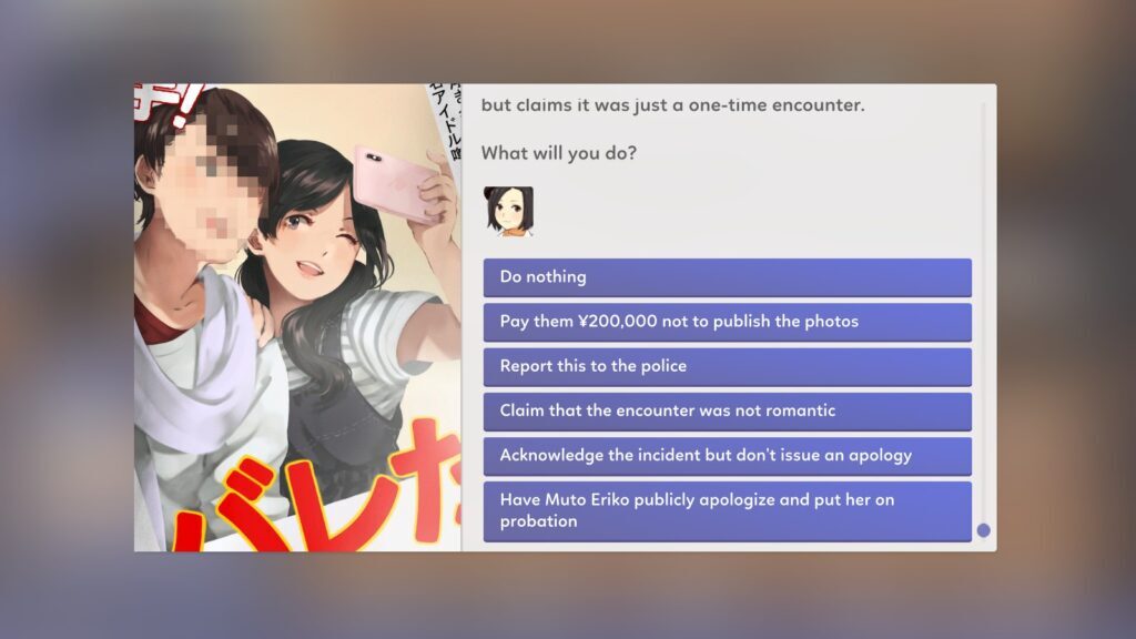 악명 높은 스캔들조차도 때때로 나타날 수 있습니다. 이것은 에이전시뿐만 아니라 플레이어로서의 자세를 테스트합니다. 소속사의 데이트 금지 정책에도 불구하고 데이트를 하다 걸리면 아이돌의 편을 들어야 할까요? 내용이 다소 어두워질 수 있으며 대부분은 장면의 더 더러운 면을 인정하는 것을 부끄러워하지 않습니다.