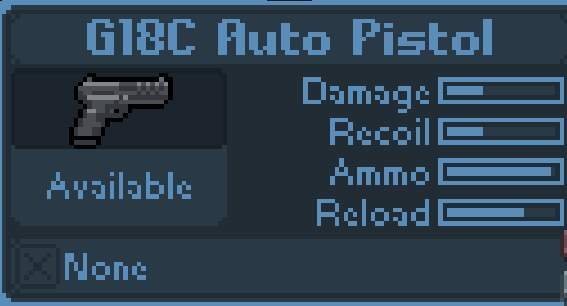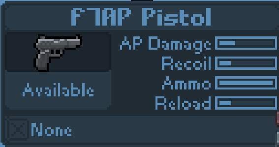 그녀의 유일한 AP 피해 총. 데미지는 낮지만 이 총을 사용하면 장갑을 낀 적과 어느 정도 맞붙을 수 있습니다. 그러나 이것은 자살 폭탄 테러범과 붉은 반다나 마체테를 다루기가 훨씬 더 어려워진다는 것을 의미하므로 c4로 사용하려면 위반 혐의를 가져 오십시오.