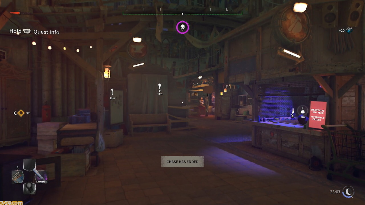또한 야간은 좀비에서 도망치고 있으면 화면 중앙에 "CHASE LVL"이 표시되게 된다. 이 레벨은 좀비로부터의 주목도와 같으며, 높을수록 더 강한 좀비가 덮쳐 온다. 레벨이 2에 올랐을 때에 출현하는 고속 좀비(명칭 모르는)는, 도망쳐도 도망쳐도 플레이어에게 쫓아오는 매우 성가신 존재. 좀비로부터 도망치고 싶은 경우는, 지면을 달리지 않고 지붕 등에 오르는 편이 안전할 것 같다.
