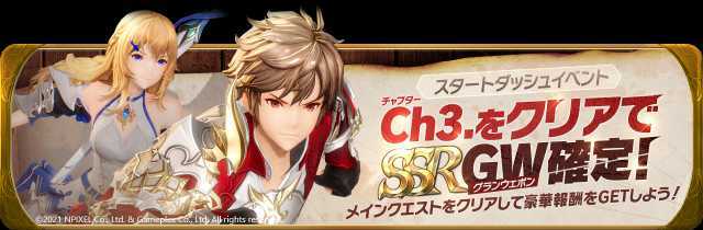 메인 퀘스트 진행으로, SSR 그란 웨폰 등의 호화 보상을 받을 수 있는 「스타트 대시 이벤트」를 개최합니다. 특정 퀘스트를 클리어 해 나가는 것으로, 스토리의 진행도 보수와 함께 더욱 보상을 획득할 수 있습니다.