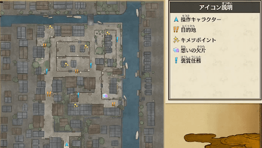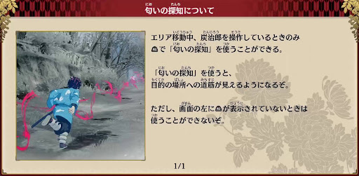 탄지로를 조작하고 있을 때는, 맵상에서 「R2」를 누르면 냄새의 탐지를 할 수 있어 목적지에의 길을 볼 수 있게 된다. 맵 이동 중 화면 왼쪽에 "R2"가 표시되어 있을 때는 언제든지 사용할 수 있으므로 길을 잃으면 R2를 눌러 보자.