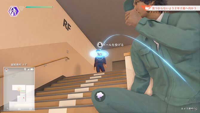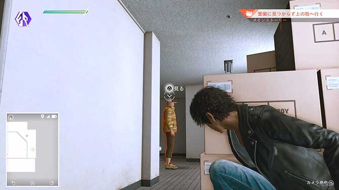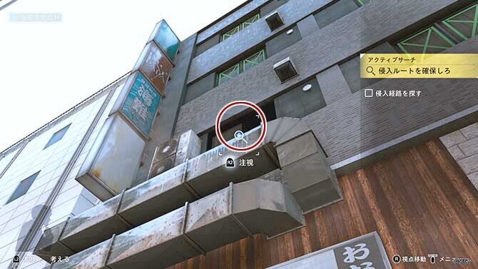 잡거 빌딩 3층의 열린 창을 R2로 주시하고, ○버튼으로 조사한다.