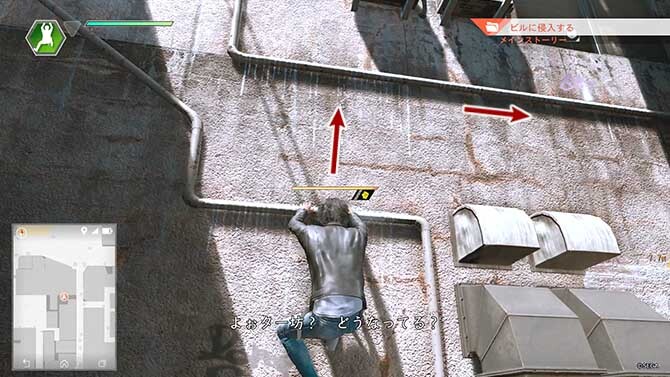 기본은 ○길게 누르기+왼쪽 스틱의 상하로 오르내리면서, 잡거 빌딩의 창문으로 향한다.