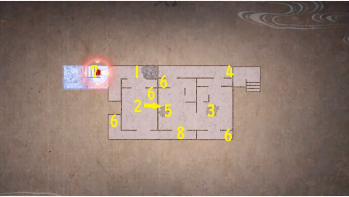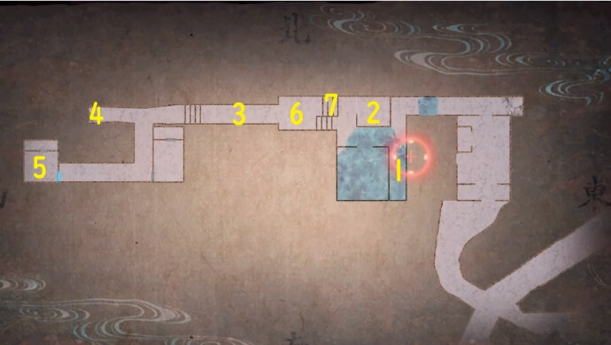 ⇒ 오가미즈 , 14식 필름×2 , 만요마루 - 1층 라운지 앞 복도로 이동, 린넨실 앞의 벽을 촬영하여 기어나는 그림자 를 입수