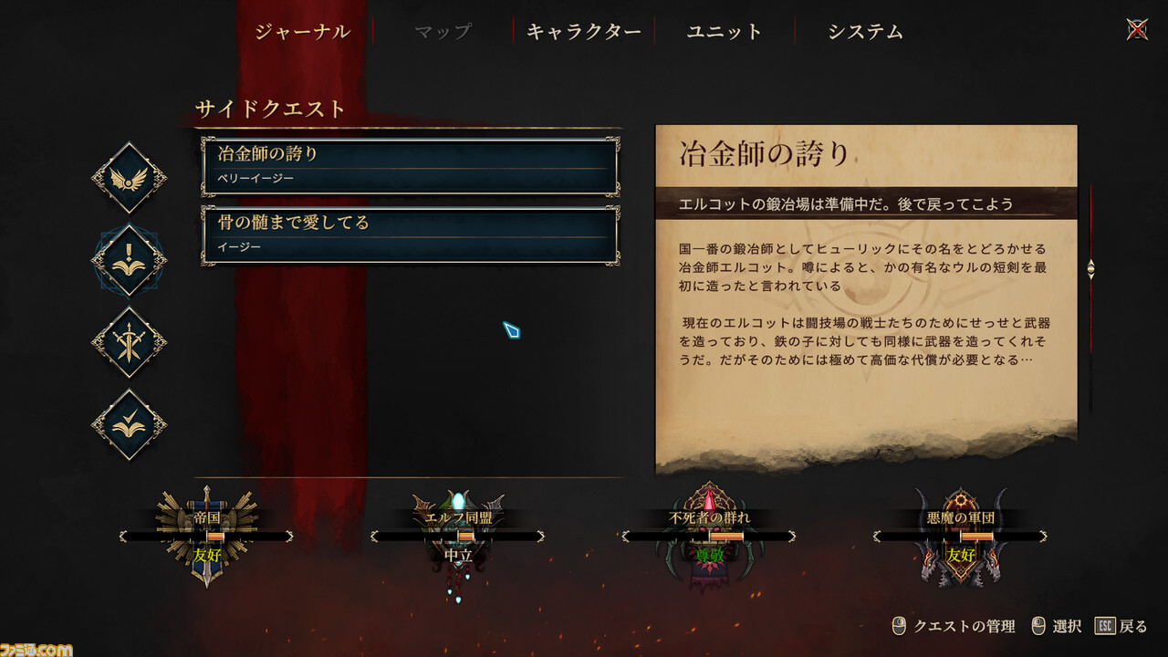 각 세력과의 관계는, 받은 퀘스트의 결과나 스토리 내에서의 선택지에 따라 변화해 간다.