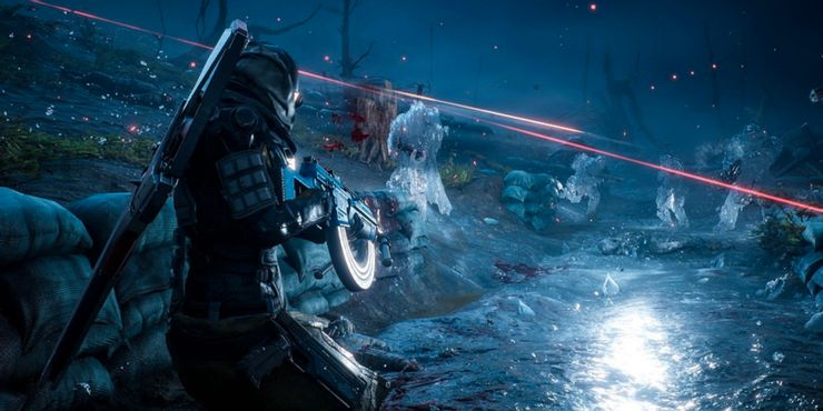 일부 얼어붙은 적들이 앞에 있는 어두운 진흙 투성이의 전장에 서 있는 테크노맨서