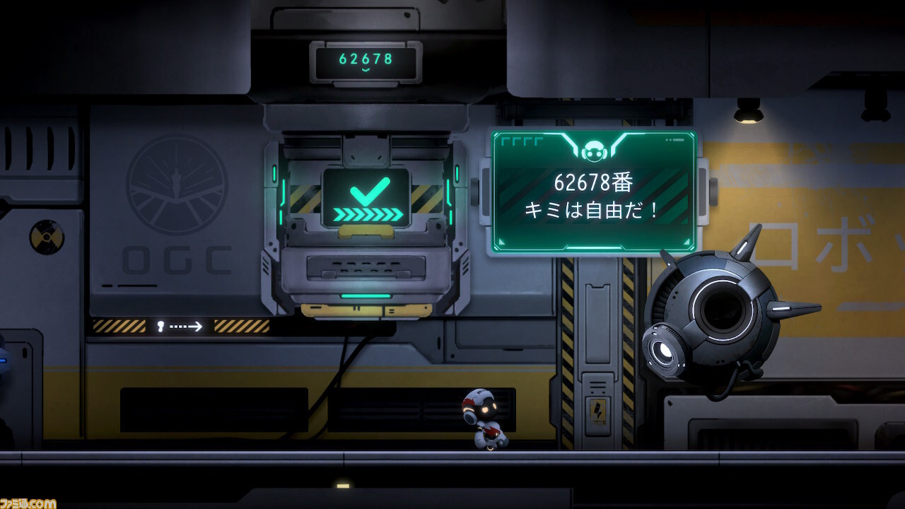 희미한 창고 같은 장소에서 캡슐에 들어간 작은 로봇 '모노봇'이 크레인으로 옮겨져 외부 세계로 뛰쳐나온다. 모노봇이 움직이기 시작하면, 눈앞의 둥근 기계에 모습을 볼 수 있고, 배후의 전자 게시판에는 「62678번 너는 자유다!」라고 하는 문자가.