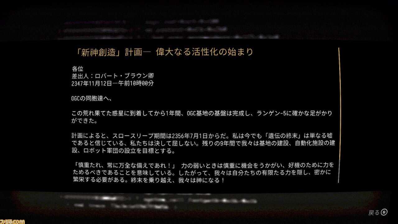 자세한 내용은 덮을 수 있지만 문헌에서 말하는 스토리의 배경은 면밀하게 반죽된 SF의 세계관이 되어 있어 매우 읽을 수 있는 내용이 되고 있다. 게임 내에서 자주 등장하는 "창신"이라는 워드의 세부 사항 등 SF를 좋아하게는 견딜 수없는 설정이 풍부합니다. 꼭 모든 문헌을 모아서 스토리를 읽어 봐 주었으면 한다.