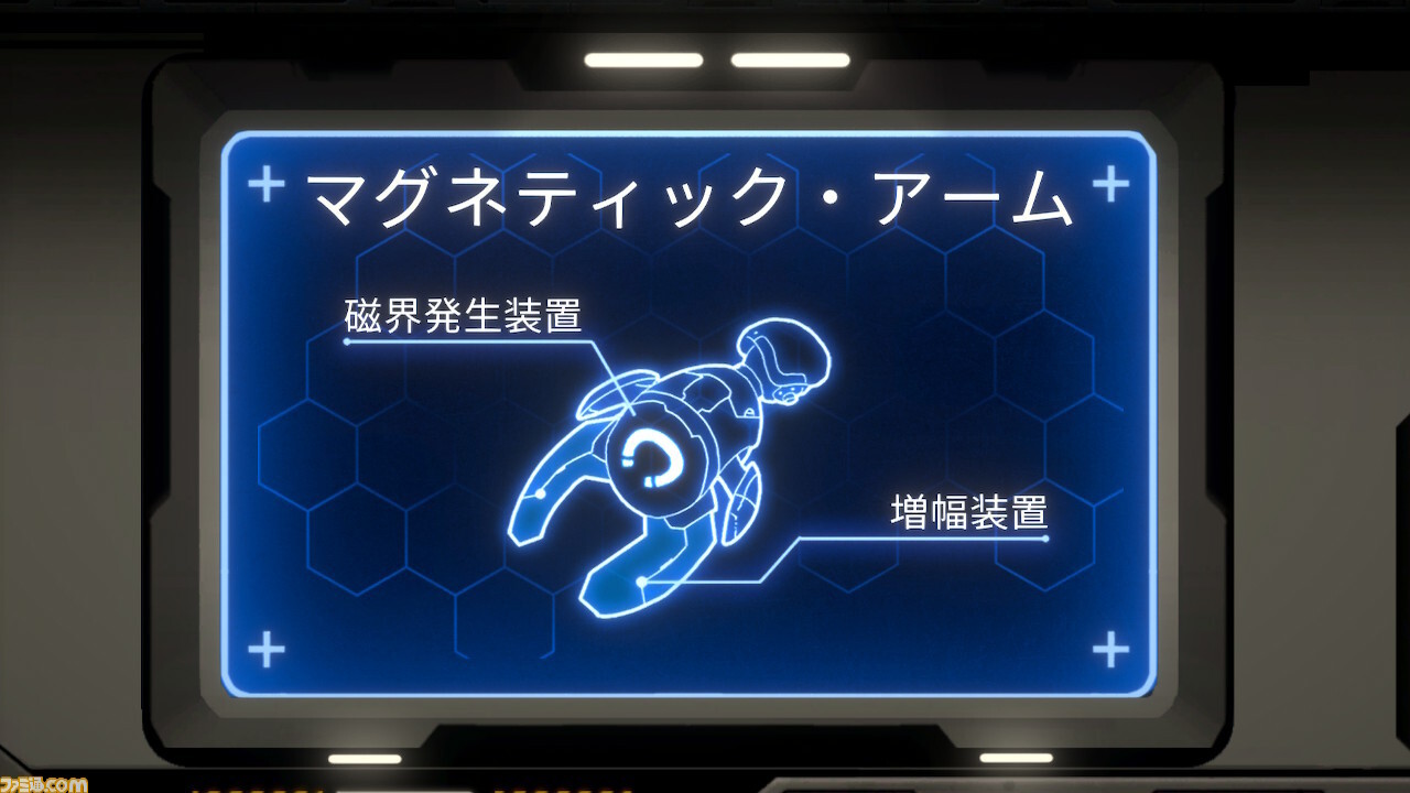 초반에 손에 들어오는 것은 일부 천장 등에 붙이게 되는 "마그네틱 암". 이것은, 자계를 발생시킨 범위에 자성이 있는 물건이 있으면, 거기에 끌려 붙이는 것. 점프 대신 사용하는 장면도 많다.