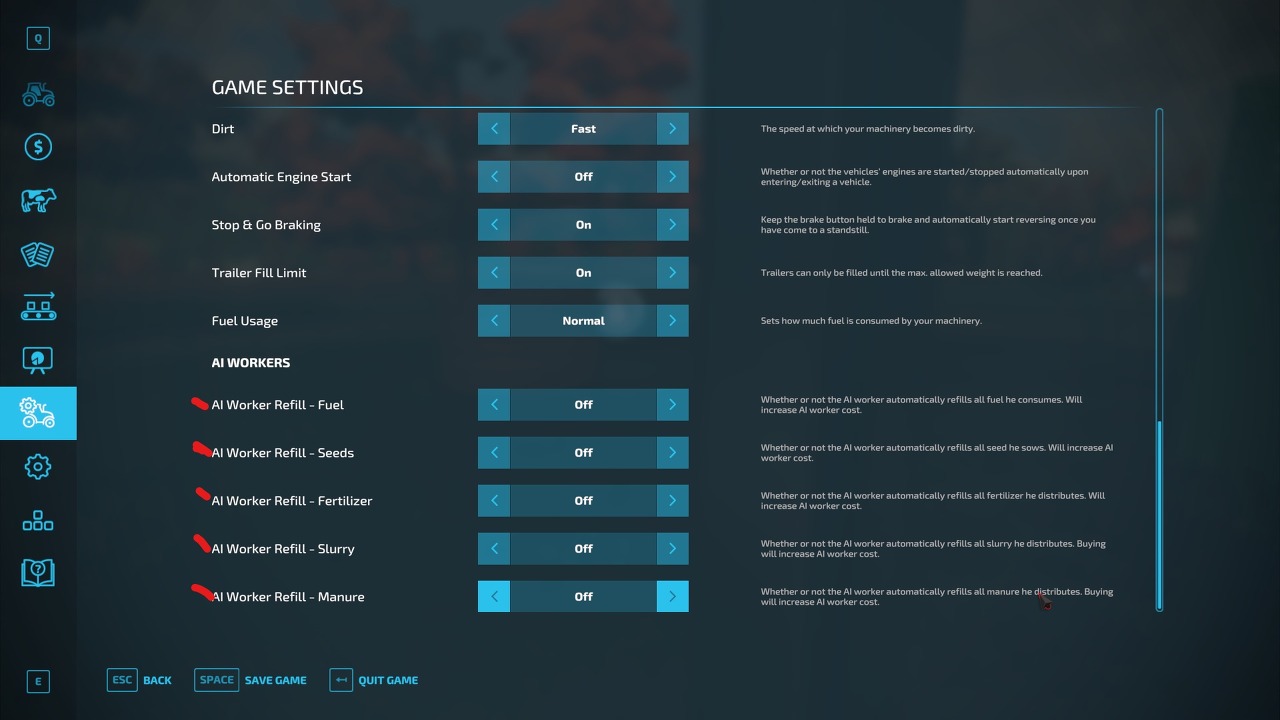 - 설정에서 AI 작업자 구매 끄기 — AI 작업자 가 현금을 소모할 수 있는 또 다른 방법은 사용 중인 리소스를 자동으로 다시 채우는 것입니다. 여기에는 씨앗, 비료 등이 포함됩니다. 설정 메뉴에는 이러한 구매를 끌 수 있는 몇 가지 토글이 있습니다. 이러한 것들을 수동으로 구매하는 것이 경제적으로 훨씬 더 유리하며 리소스가 고갈되면 AI 작업자를 해고하고 도구를 다시 채운 다음 작업자를 다시 길에 배치합니다.