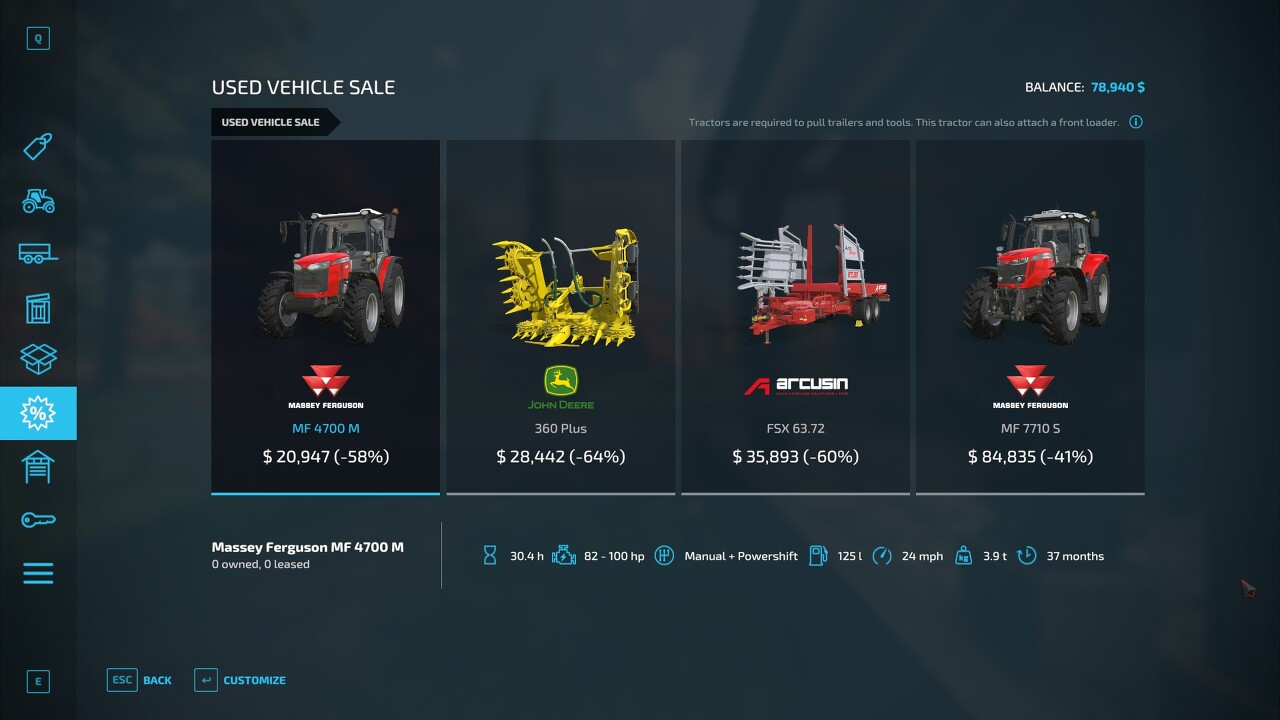 - "중고" 옵션을 정기적으로 확인하십시오. 임대의 이면에는 Farming Simulator 22 의 새로운 기능입니다 .훨씬 저렴한 가격에 중고 기계를 구입할 수 있는 능력. 그것이 좋은 만큼, 몇 가지 주의 사항이 있습니다(물론). 첫째, 할인은 기계의 수명과 유지 보수 수준에 따라 다릅니다. 따라서 할인이 좋을수록 장비를 다시 정상화하는 데 더 많은 돈을 재투자해야 합니다. 중고 기계는 또한 새 장치만큼 작동하지 않습니다. 이는 추가 마력을 얻기 위해 원하는 더 큰 트랙터에 특히 문제가 될 수 있습니다. 따라서 항상 염두에 두십시오. 마지막 문제는 중고 시장이 게임 내 몇 시간마다 들어오고 나가는 제안으로 끊임없이 유동적이라는 것입니다. 진정으로 가치가 있는 것이 있는지 확인하기 위해 자주 확인해야 합니다.