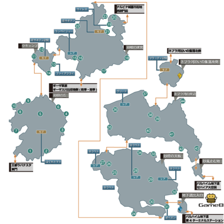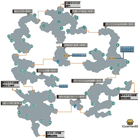 기자 초원에는 건기와 우기가 있으며, 각 계절에 지형과 출현 몬스터가 바뀝니다. 건기와 우기는 스토리의 진행도와 플레이 시간으로 전환하는 사양입니다. 스토리 초반부터 새벽의 단편을 입수할 때까지는 반드시 건기 이며, 이후에는 우기와 건기가 교대로 전환됩니다.