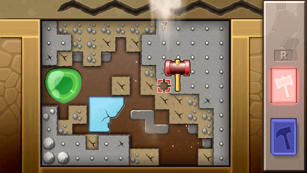 | 붉은 망치로 25회, 푸른 망치라면 50회 두드리면 금이 왼쪽 상단에 도착합니다. |