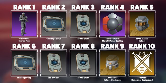 이 누출에 따르면 이벤트는 2월 8일에서 2월 22일 사이에 진행되며 플레이어에게 10개의 보상을 제공합니다. 보상 중 3개는 XP 부스트이고 2개는 챌린지 스왑 토큰이지만 나머지는 고유합니다. 하나의 색상 팔레트인 Scorpion Punch와 Claw Patrol Spartan 포즈, Mark 5 Zeta 헬멧 및 Mauros 헬멧 부착물이 있습니다. 최종 순위에 도달하면 "Lone Wolf" 명판 배경을 얻을 수 있습니다.