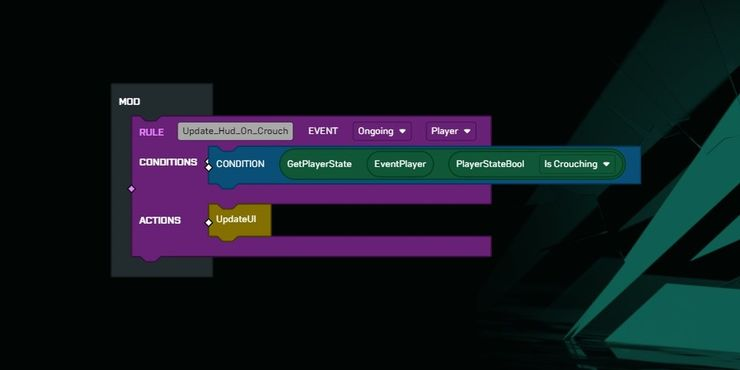 조건 블록은 로직 편집기의 "규칙" 탭에서 찾을 수 있습니다. 이 파란색 블록은 논리 인수가 작동하여 true, false, 보다 큼, 보다 작음 등을 확인 해야 합니다 . Condition 블록이 있더라도 규칙 블록이 다시 활성화되려면 Condition이 true보다 false가 되어야 합니다. 예를 들어, 플레이어가 웅크리고 있을 때의 조건이 있다고 가정해 보겠습니다. 캐릭터가 쪼그리고 앉으면 StateBool이 "True"가 되어 Rule 블록이 실행됩니다. 일어서면 StateBool이 "False"가 되어 다음에 웅크리면 Rule 블록이 다시 트리거됩니다.