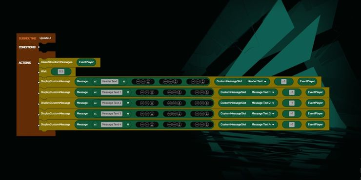 아래 예에서는 로직 편집기를 사용하여 플레이어 화면에 수많은 UI 요소를 추가합니다. 코드를 더 쉽게 읽고 재사용할 수 있도록 이 규칙을 "UpdateUI"라는 서브루틴으로 변환합니다. 이것은 서브루틴을 사용하여 코드를 정리하고 게임 모드를 만드는 시간을 절약할 수 있는 여러 방법 중 하나일 뿐입니다.