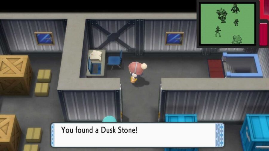 Snowpoint 체육관을 이기고 Lake Acuity의 이벤트를 본 후 이야기의 다음 부분은 Veilstone City에 있는 Team Galactic Headquarters로 이동합니다. 황혼의 돌은 플라이를 얻은 창고 문 바로 뒤에 있습니다.