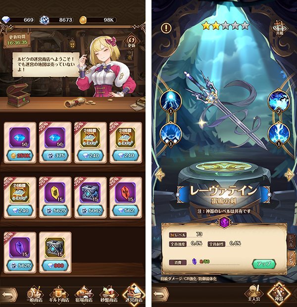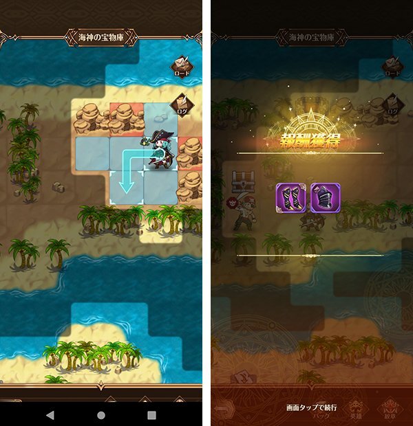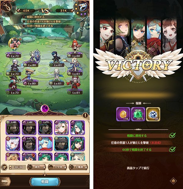 배틀을 이기면 경험치나 장비 아이템, 영웅의 소환에 필요한 다이아몬드 등 다양한 보상을 얻을 수 있다. 그들을 바탕으로 캐릭터의 레벨이나 장비 , 주인공이 가진 '신기' 라고 불리는 무기 등 다양한 포인트를 강화해 나가자.