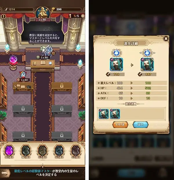 복수 소지하고 있는 캐릭터를 2체 이상 합성하는 것으로 레어리티를 주는 「운명의 성당」 이나, 배틀 중 영웅 1체에게만 부여할 수 있는 스테이터스 업의 「각인」 , 불필요한 캐릭터를 아이템화하는 것으로 , 다른 캐릭터의 레벨업으로 이어지는 「구름의 숙소」 등 다양하다.