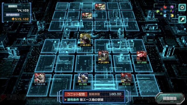 출격시에는 화면에 매스가 표시되어 출격시킨 MS를 앞 공간에 자유롭게 배치 가능.