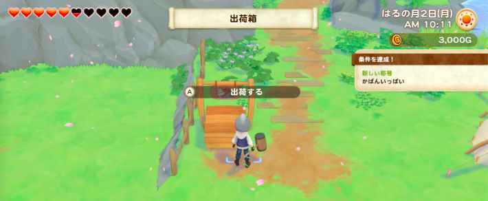 집 근처의 출하 상자에 아이템을 넣으면 다음날 매각되어 골드를 얻는다. 키운 농작물이나 만든 아이템을 출하하여 수입을 얻자.