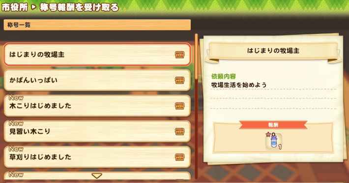 시청에서는 자신이 달성한 칭호의 보상을 받을 수 있다. 보상으로는 작물의 종이나, 잉곳 메이커 등 다양한 아이템을 입수할 수 있으므로, 칭호를 어느 정도 달성하면 시청에 가서 보상을 받자.
