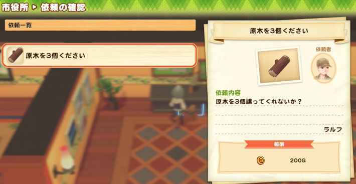 시청에 가면, 거리의 주민으로부터의 의뢰를 수주해 보상을 받을 수 있다. 특히, 촌장과의 대화 이벤트 후에 발생하는 의뢰를 해내면 거리를 발전시킬 수 있으므로, 촌장으로부터의 의뢰는 최우선으로 소화 하자.