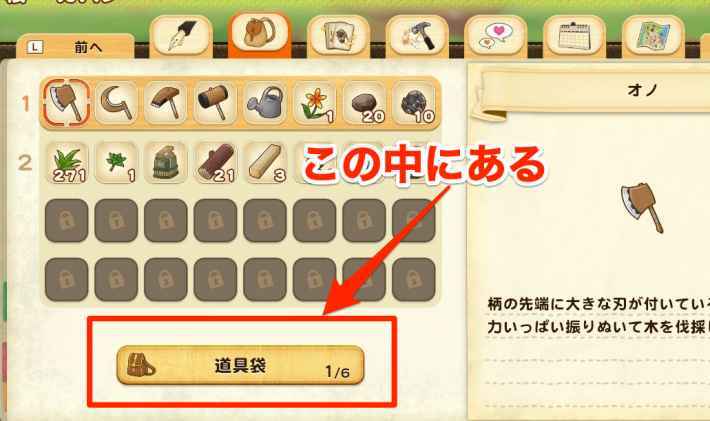 촌장에게 받은 도구는, 가방의 맨 아래에 있는 도구봉투로부터 꺼낼 수 있다 . 소지의 아이템이 가득 차면 도구를 버리는 것으로 스페이스를 비울 수도 있다.