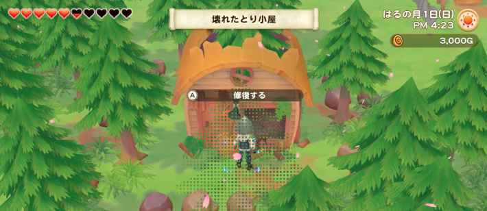 1일째는 촌장에게 받은 도구를 사용해 기본적인 소재를 모으자. 특히 원목이나 철광석은 대량으로 필요 하므로 우선적으로 모아 두자. 풀은 취급 오두막의 수리에 필요한 분만 모으면 일단은 OK.