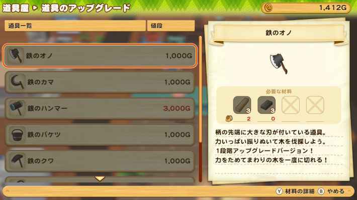 도구점에서 도구를 업그레이드하면 적은 수의 수로 나무와 바위를 부수거나 Y를 길게 눌러 한 번에 광범위에 사용할 수 있는 '위험'이 가능 해지는 등 성능이 강화된다. 또한 업그레이드 단계에 따라 액션 범위가 넓어집니다.