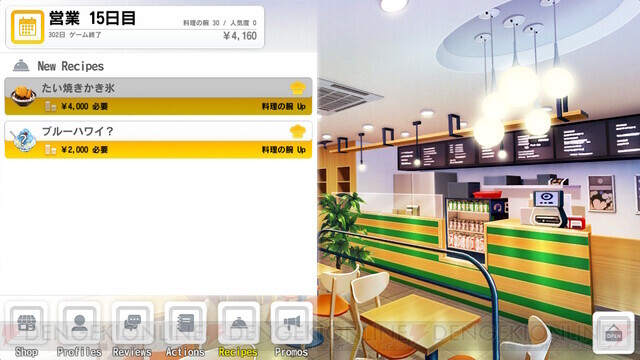 “Recipes”로 새로운 빙수를 연구함으로써 벌 수 있는 돈이 상승. “Review”는 손님으로부터의 평가입니다만, 가끔 리퀘스트가 있는 것도. “Recipes”로 요청 메뉴를 개발하여 제공하면 VIP 고객이 됩니다.