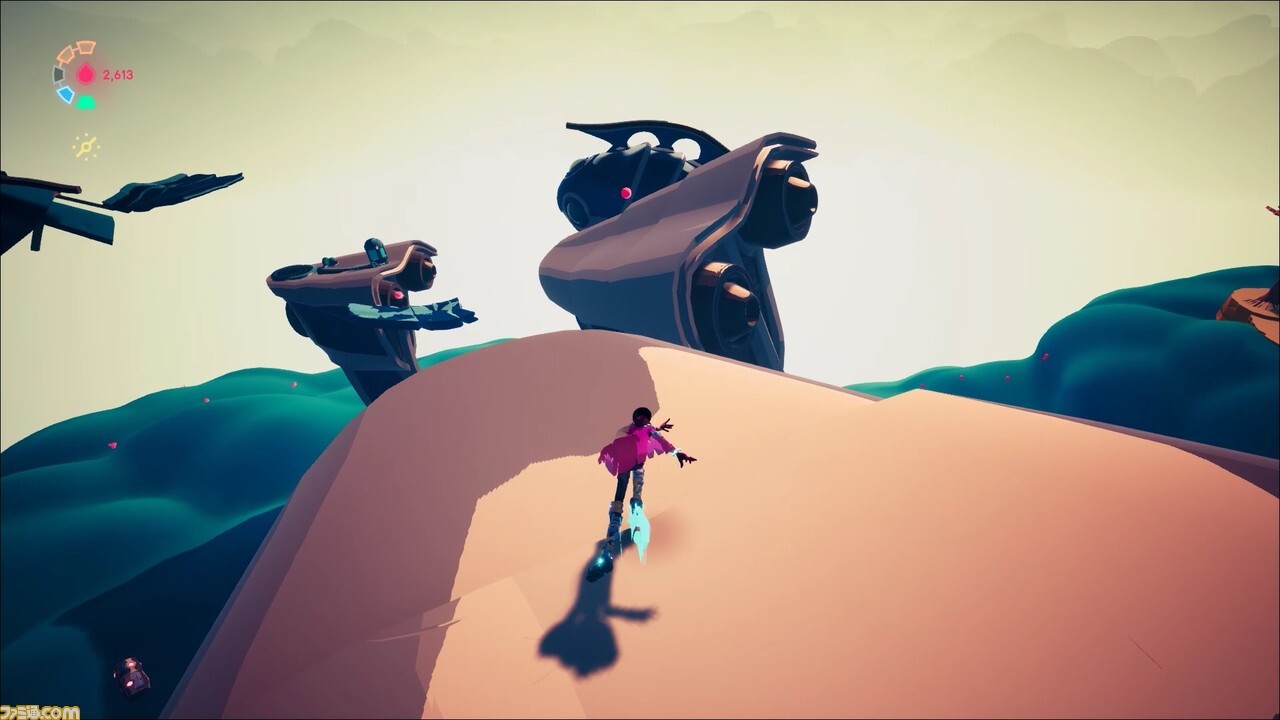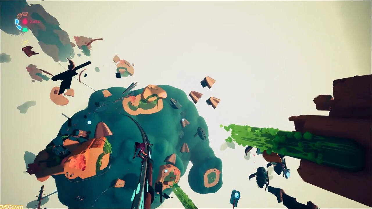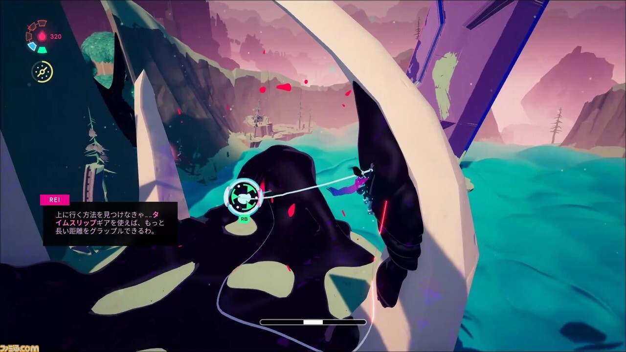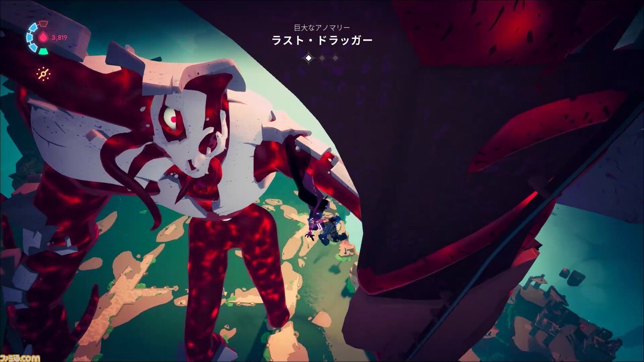대시해서 파괴, 점프로부터 그래플링 훅으로 다음을 파괴, 또 다음의 목표에 달려……라고 하는 것을 거대 보스 위에서 해 간다. 덧붙여서 이것은 팔 부분을 달리고 있는 곳.